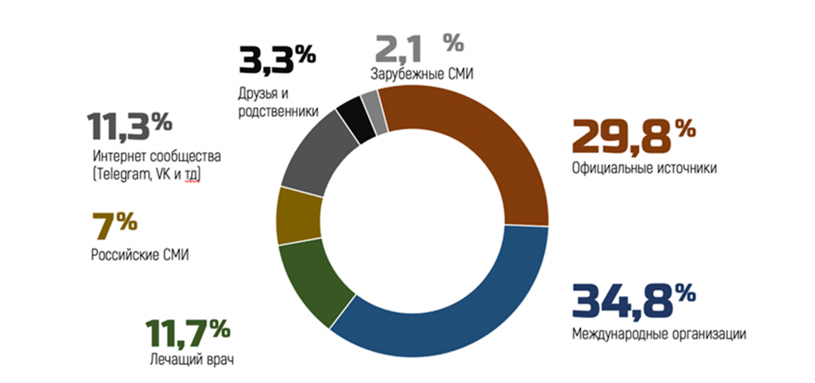 Среди источников информации о COVID-19 респонденты чаще доверяют данным международных организаций (38%), 29.8% — официальным источникам, 11.7% — лечащему врачу.