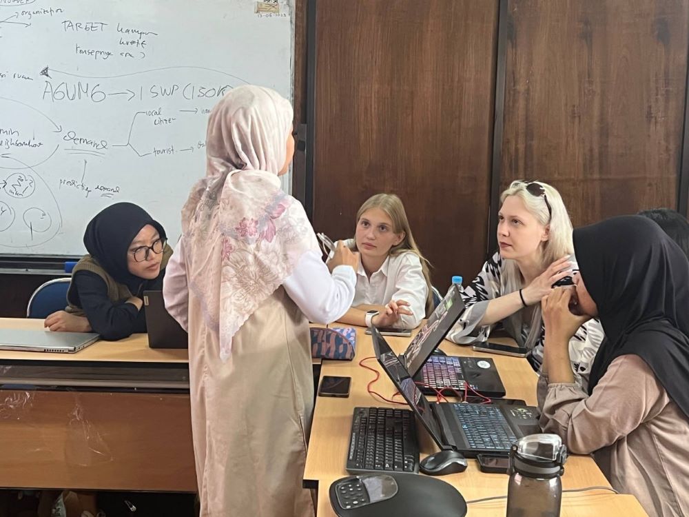 Очный этап научной школы прошёл в Суракарте в формате интенсивной недели: 16 академических часов лекций и практикумов по циркулярной экономике сочетались с выездами в поле и мозговыми штурмами по созданию круговой бизнес-модели для системы школьного питания и управления пищевыми отходами. Уже в первый день участники встретились с руководством факультета UNS, представили университеты и сами проекты, а затем включились в подробный вводный инструктаж по национальной программе школьного питания, которая стала центральным кейсом школы. Индонезийские коллеги объяснили, как устроен пилот: какие объёмы ресурсов задействованы, что университет делает как наблюдатель и какие зоны риска уже видны на уровне практической реализации. Дальше началась работа в смешанных группах UNS—РУДН: студенты сразу разделились на небольшие команды, чтобы совместно спроектировать инструментарий полевого исследования.
