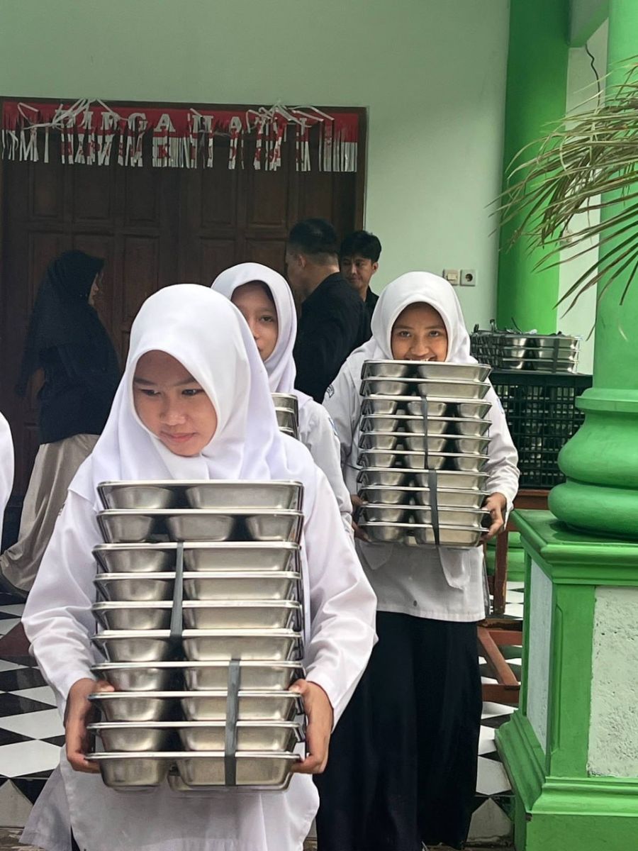 «В рамках пилотной программы у детей было не особенно разнообразное меню: рис, приготовленный в разных вариациях, фрукт (обычно папайя), салат из овощей, иногда мясо или рыба/морепродукты. Всё это готовилось на общественной кухне, упаковывалось в металлические боксы для еды и развозилось по школам. А дети, получив еду, питались прямо в классах (в Индонезии нет специально отведенных мест в школе для принятия пищи). Приготовленная для школьников еда не остужается, а полугорячая доставляется по школам (учитывается временной фактор приготовления каждой партии, потому что доставка начинается одновременно около полудня). Очень часто доставка задерживается из-за трафика. Но несмотря на это, процент испорченной еды совсем мал. Пищевые отходы появляются в основном потому, что меню, которое правительство составило как «здоровое и сбалансированное», не нравится детям по вкусу. Многие дети не питаются в школе. Другие могут взять еду из дома, поэтому к школьной они даже не притрагиваются. Ребята сказали, что у них была ещё выездная кухня, которая готовила вкусно. Еда была относительно дешёвой, но пилотный проект был в целом рассчитан на детей из семей, которые не могут дать им карманных денег на еду в школе или собрать ланч-бокс», — Мария Потапкина.
