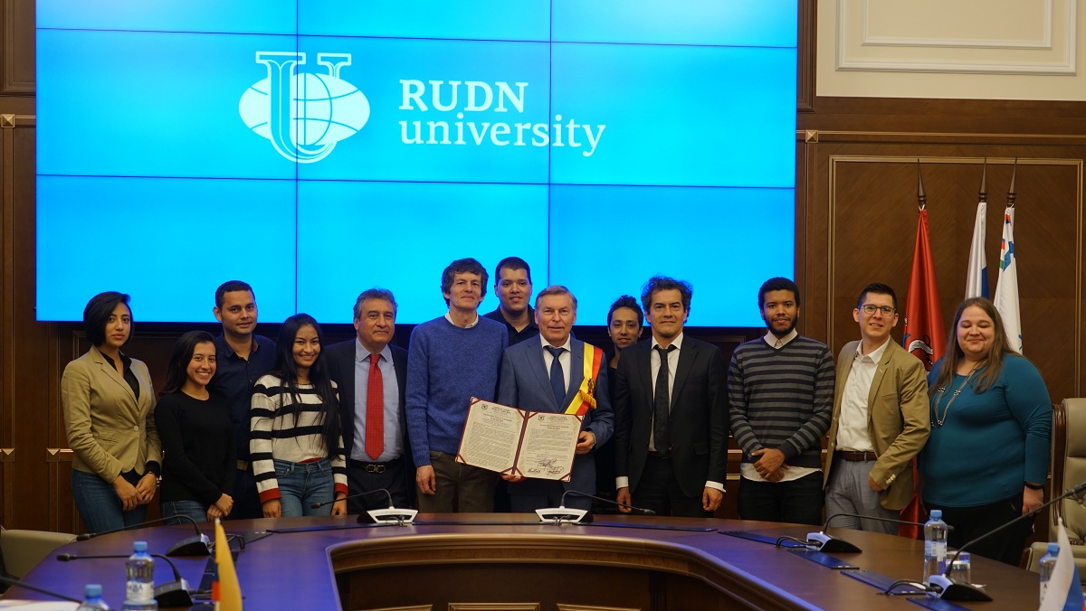 Вручили орден ректору колумбийские выпускники: Рубен Дарио Флорес Арсила – президент института им. Льва Толстого, профессор Национального Университета г. Боготы, выпускник историко-филологического факультета УДН (1983); Хуан Карлос Флорес Арсила – член Городского Совета г. Боготы, выпускник историко-филологического факультета УДН (1985); Хорхе Товар Фереро – экономист и бизнесмен, выпускник факультета экономики и права УДН (1985).