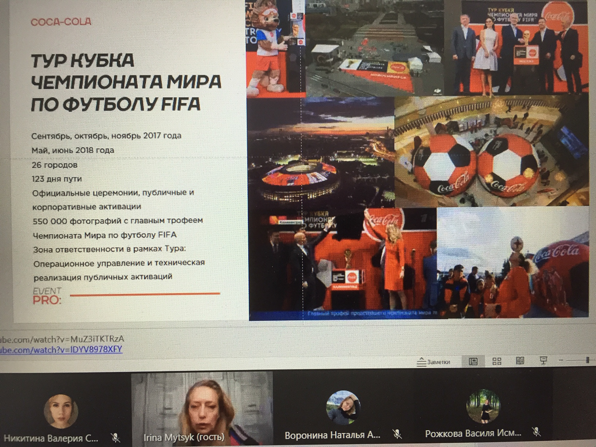 На мастер-классе Ирина рассказала о проекте FIFA WC 2018 для бренда «Кока-Кола». Когда активируется мероприятие мирового масштаба важна тщательная подготовка проекта, сплоченность команды, умение быстро реагировать на непредвиденные обстоятельства, иметь план «B» и быстро принимать решения.
