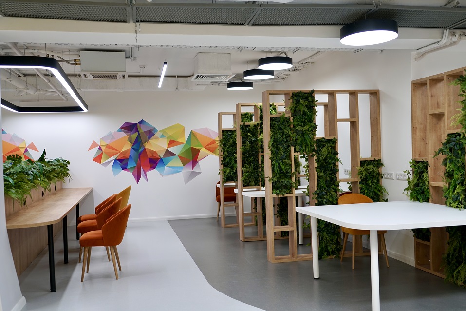 Желто-оранжевые цвета, постеры в стиле современного искусства, модные светильники, мотивационные слоганы, графические паттерны на стенах и более 825 кв. метров — у коворкингов в главном корпусе появился конкурент.