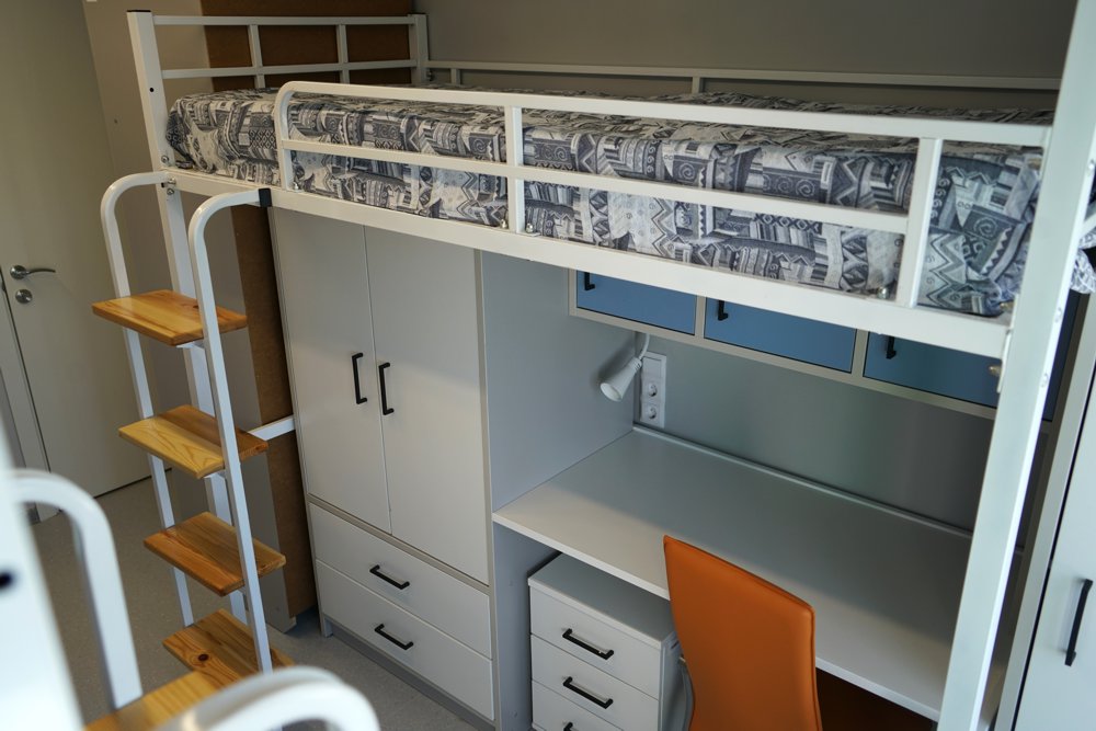 В комнате есть всё необходимое. Индивидуальное рабочее место, многофункциональные шкафы и тумбочки для хранения вещей, удобные кровати со светильниками и даже специальная полочка для телефона. Но самое главное — WiFi. Попробуем подключиться. Не выходит. Олег Александрович говорит: