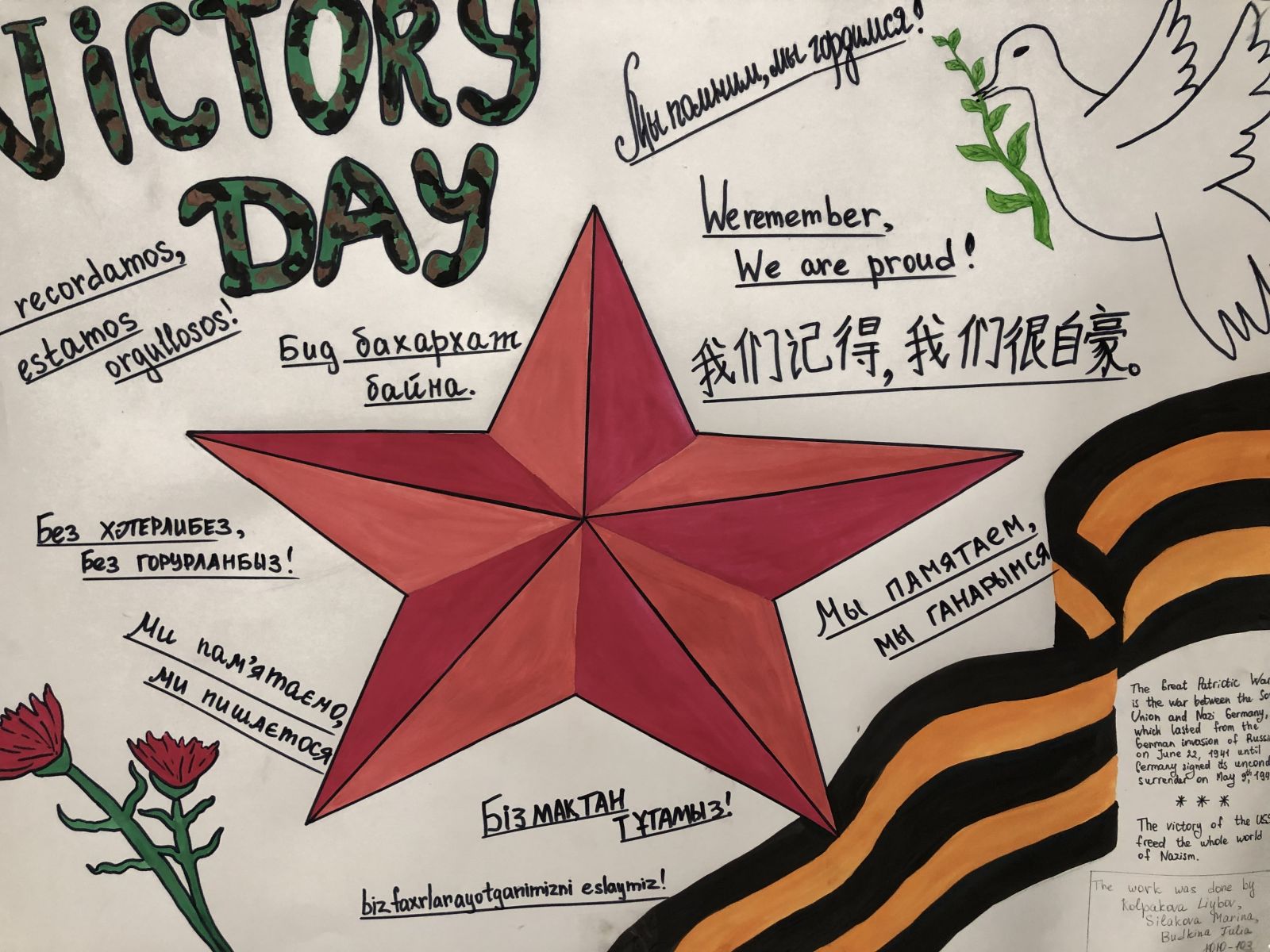 «Мы с удовольствием поддержали идею иноязычных плакатов на тему Дня Победы. Наше поколение бесконечно благодарно предкам за их Великий подвиг! И это наша маленькая благодарность за неоплатный долг перед падшими воинами», – студенты ЮИ Арина Маношкина, Альберт Хайрутдинов, Анна Федотова, Инна Гришова, Анна Викенттева, Дарья Олейник, Алина Газизова, Валентина Никитина, Алина Хохлова.