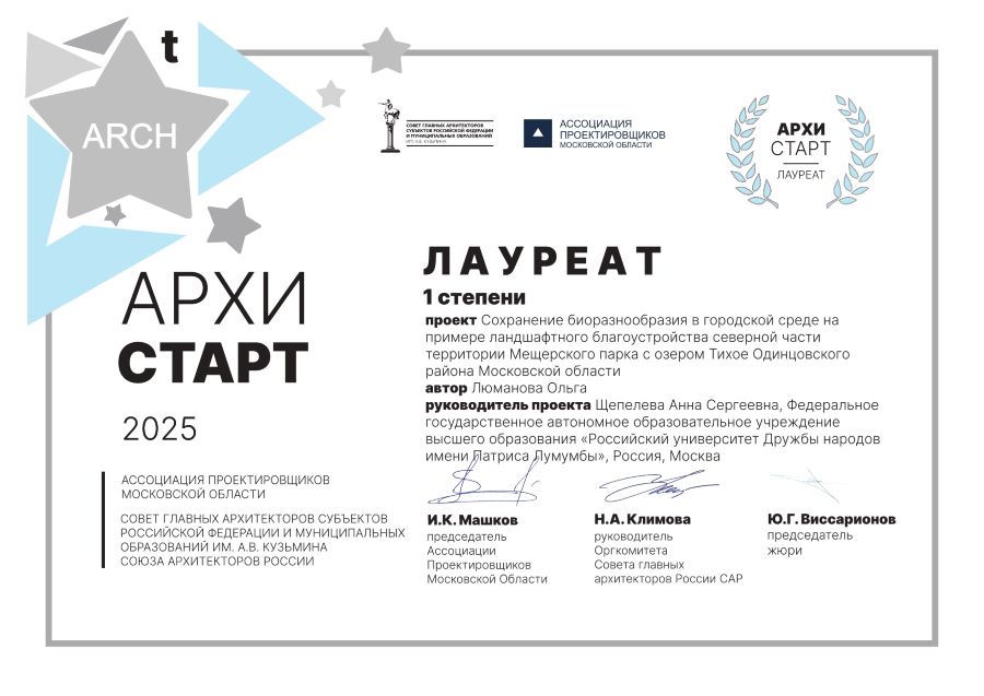 Выпускница направления «Ландшафтная архитектура» Ольга Люманова заняла первое место в номинации «Зеленая инфраструктура» на международном конкурсе «АрхиСтар-2025». Она представила на суд жюри масштабную работу: «Сохранение биоразнообразия в городской среде на примере ландшафтного благоустройства северной части территории Мещерского парка с озером Тихим Одинцовского района Московской области».